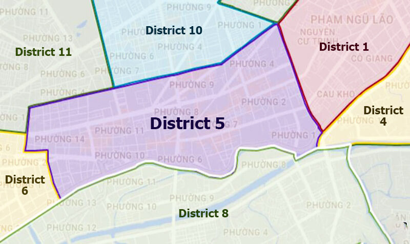 - Ngoài ra, bạn có thể dễ dàng di chuyển từ quận 5 trong bán kính 5km để sang các quận khác như quận 1, quận 7, quận 4, quận 6, quận 8, quận 10 và quận 11.