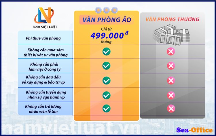 Cụ thể, với mức giả khởi điểm từ 500 ngàn đồng/tháng (tức chỉ 16 ngàn đồng/ngày), tương đương với giá thành của một ly trà sữa hay một ổ bánh mì mỗi ngày, dịch vụ cho thuê văn phòng ảo quận 9 TPHCM của Nam Việt Luật sẽ cung cấp cho bạn: