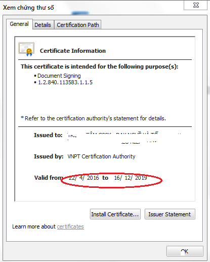 Sau khi nhấn xem ô cửa sổ ghi hạn sử dụng Token VNPT của bạn sẽ xuất hiện