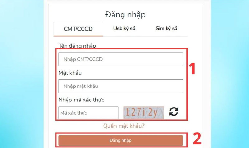 - Bước 3: Điền đầy đủ thông tin gồm: Tên đăng nhập (Nhập CCCD/ CMT); Mật khẩu; Mã xác thực (Những dãy ký tự nằm ở khung bên phải).