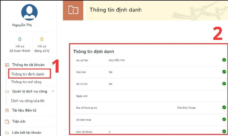 - Bước 8: Chọn “Thông tin định danh”. Tại đây bạn không chỉ dễ dàng số định danh cá nhân đã được sử dụng VNeID mà còn tra cứu được toàn bộ các thông tin cá nhân khác được cập nhật từ cơ sở dữ liệu Quốc gia về Dân cư.